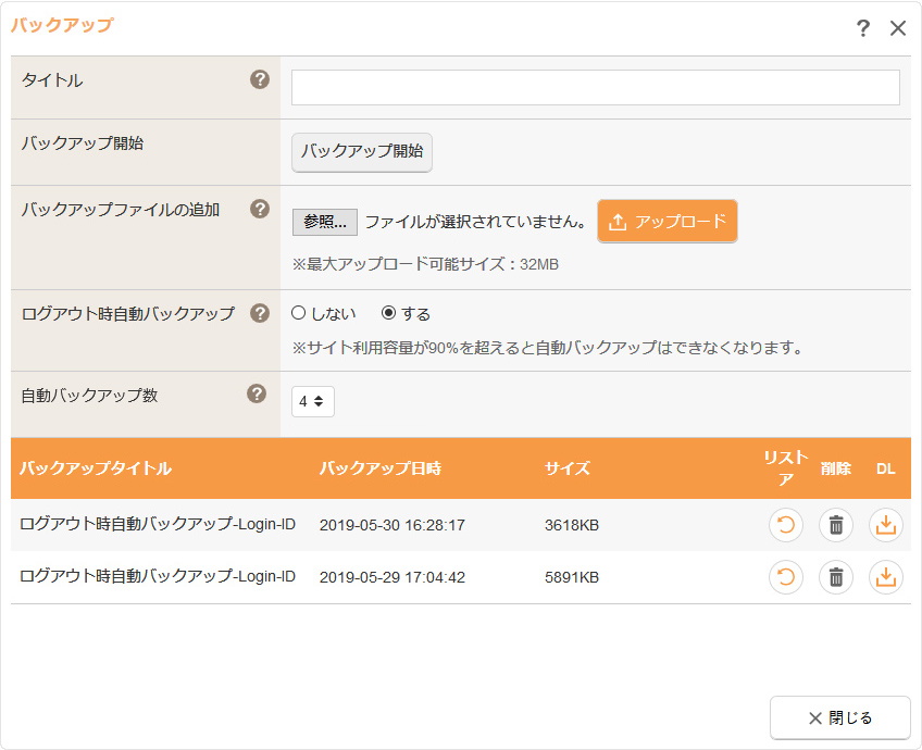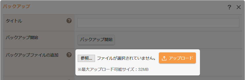 - ダイアログからアップできるバックアップファイルのサイズは32MBまでになります。それ以上のサイズの場合は、FTPソフトにてバックアップフォルダにアクセスして直接アップしてください。FTP情報の発行については運営元にご相談ください。