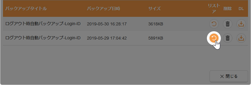 バックアップ一覧から以前バックアップした時の状態に戻したいバックアップファイルの右にある[リストア]ボタン