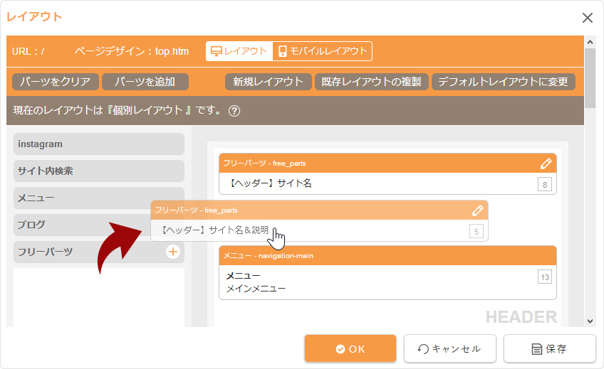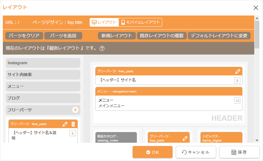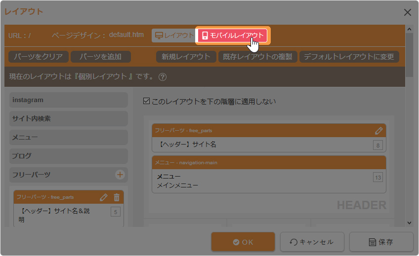 モバイルサイトのレイアウトを変更定する場合は、上部の[モバイルレイアウト]をクリックして“モバイルレイアウトダイアログ”からモバイルレイアウトを設定します。