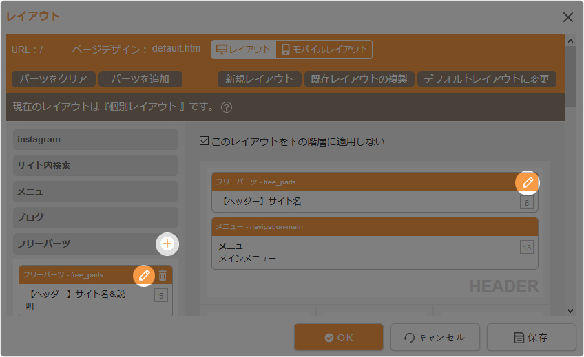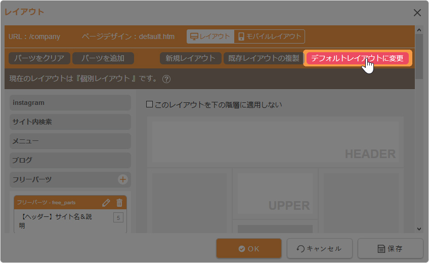 [このページに個別設定をする]ボタンをクリックして、個別レイアウトを設定してください。 - デフォルトレイアウトを設定する