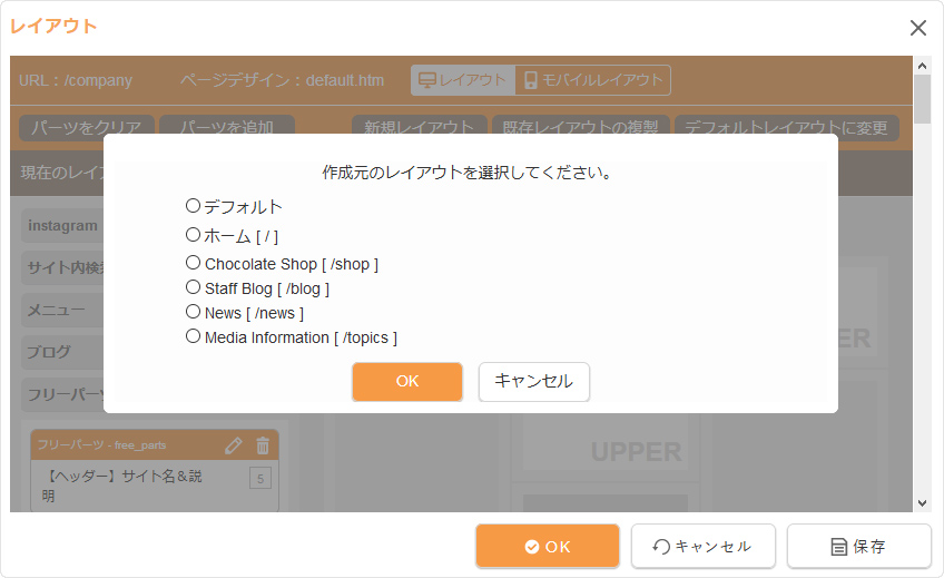 [既存レイアウトの複製]ボタンをクリックした場合、現在利用されているレイアウトの一覧が表示されますので、その中から複製したいレイアウトをチェックして[OK]ボタンをクリックしてください。