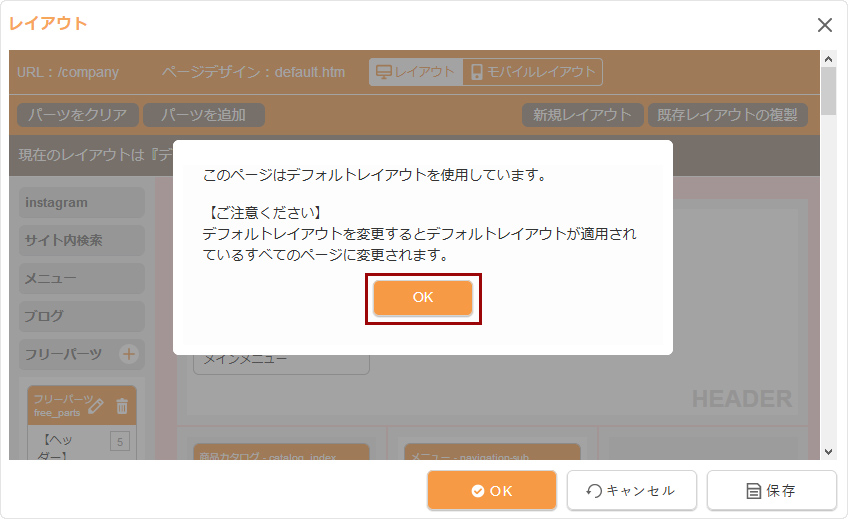 「デフォルトレイアウト(初期設定されたレイアウト)」が適用されているページで“レイアウトダイアログ”を開くと下記のメッセージが表示されます。変更したい場合は注意メッセージを確認の上、[OK]ボタンを押してから作業を行います。