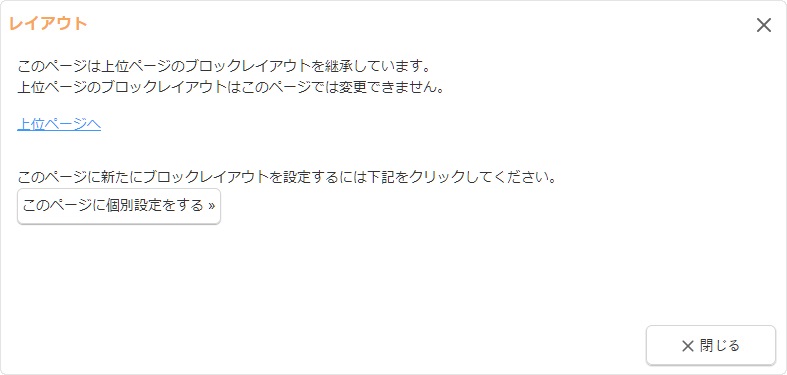 | 対象ページは「個別レイアウト」です。 対象ページには個別のレイアウトが設定されています。下の階層のページにもこのレイアウトが適用されます。(《このレイアウトを下の階層に適用しない》にチェックが入っていない場合を除く) |
