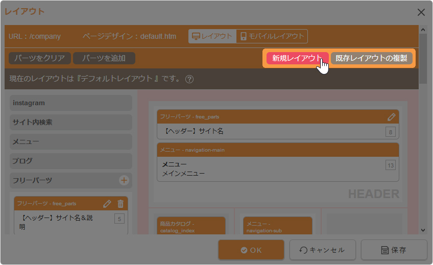 パーツが何も配置されていない状態から「個別レイアウト」を作成する場合は[新規レイアウト]ボタンをクリックします。既に別のページに適用されているレイアウトを元に作成する場合は[既存レイアウトの複製]ボタンをクリックします。