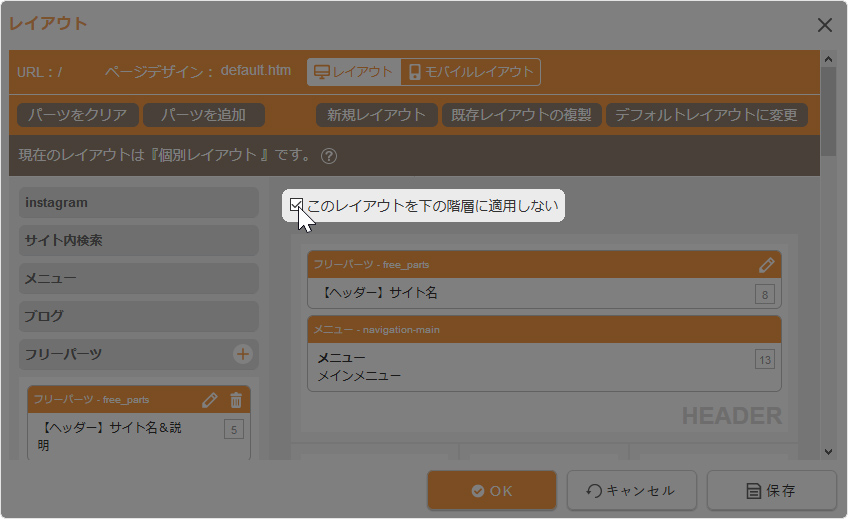 レイアウトを下の階層に継承させたくない場合は、“レイアウトダイアログ”の「このレイアウトを下の階層に適用しない」にチェックを入れて[OK]ボタンをクリックしてください。