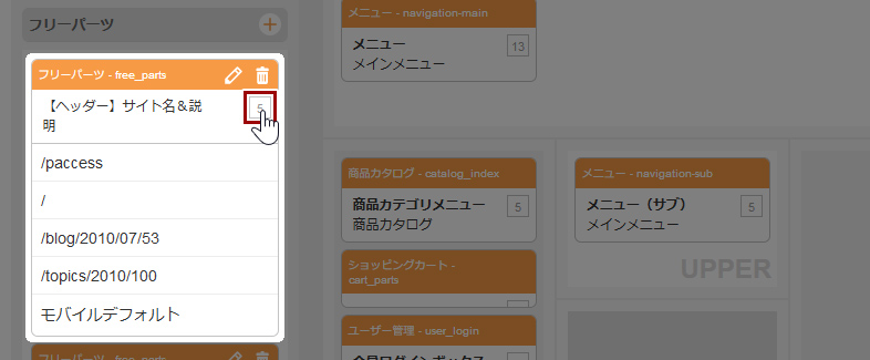 パーツ名の右側に表示される数字をクリックすると、そのパーツを使用しているページおよびURLを確認することができます。