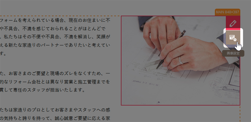 画像リンクを設定したい画像の上にマウスを合わせ、表示される[画像設定]ボタンをクリックします。もしくは画像上で右クリックをしてショートカットメニューの[コンテンツパーツ][画像設定]を選択します。
