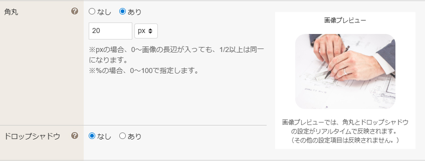 画像を角丸にするかどうか設定します。詳しい設定方法は「画像を装飾する(角丸・影)」を参照してください。