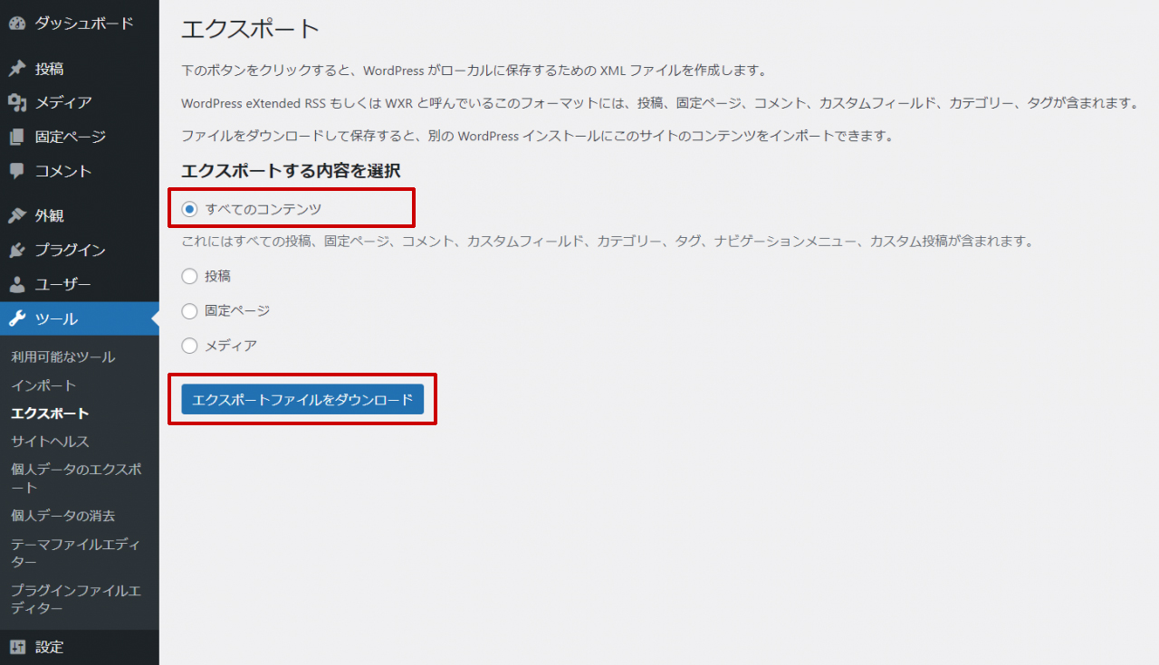 WordPressのエクスポートファイルを作成する