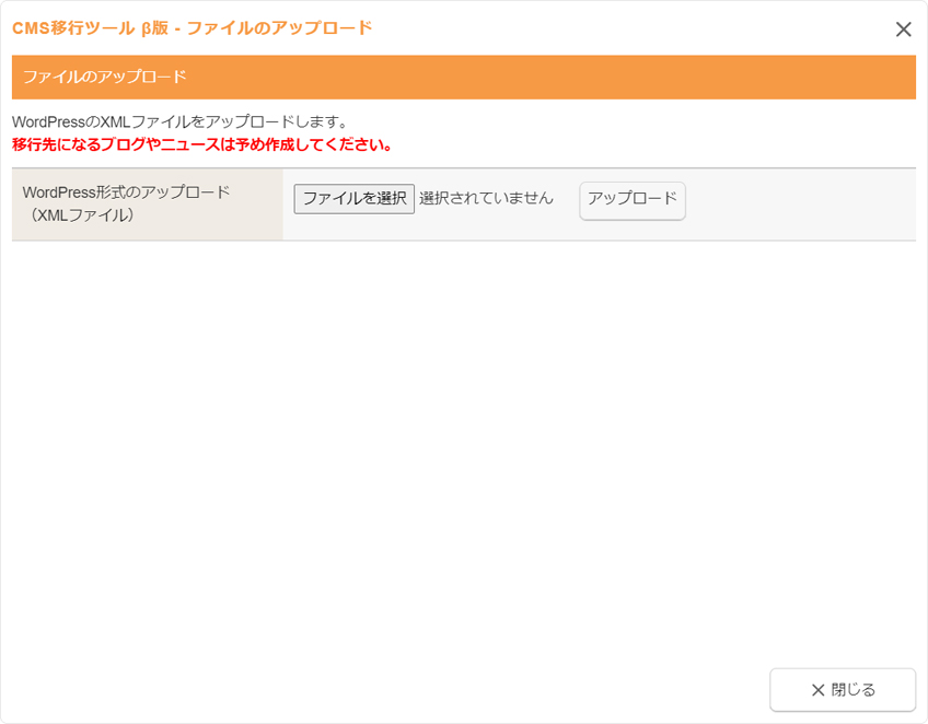 コントロールパネルから[設定] → [アプリケーション] → [CMS移行ツール β版]を選択し、“CMS移行ツール β版 - ファイルのアップロードダイアログ”を開きます。