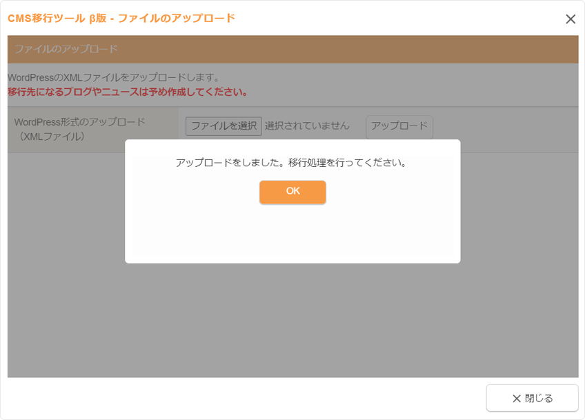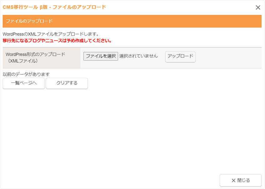 アップロードしたWordPress形式のXMLファイルのデータをダイアログからクリアする場合は、“CMS移行ツール β版 - ファイルのアップロードダイアログ”の「一覧のデータがあります」の下に表示される[クリアする]ボタンをクリックして、メッセージをOKするとクリアすることができます。