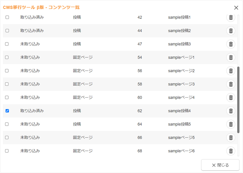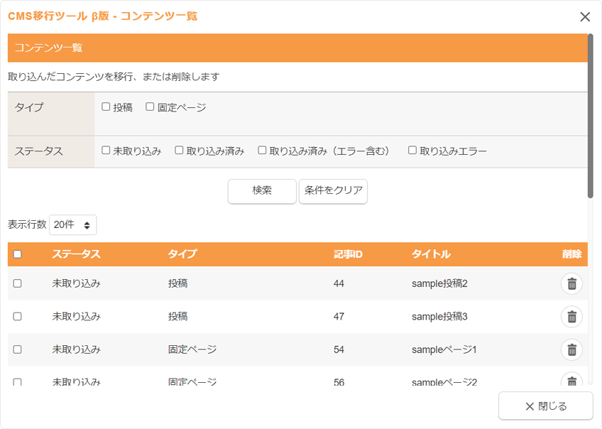 アップロードしたWordPress形式のXMLファイルはクリアするまではダイアログ内に保存されます。保存されているデータから引き続き移行する場合は、“CMS移行ツール β版 - ファイルのアップロードダイアログ”の「一覧のデータがあります」の下に表示される[一覧ページへ]ボタンをクリックすると、“CMS移行ツール β版 - コンテンツ一覧ダイアログ”が表示されます。