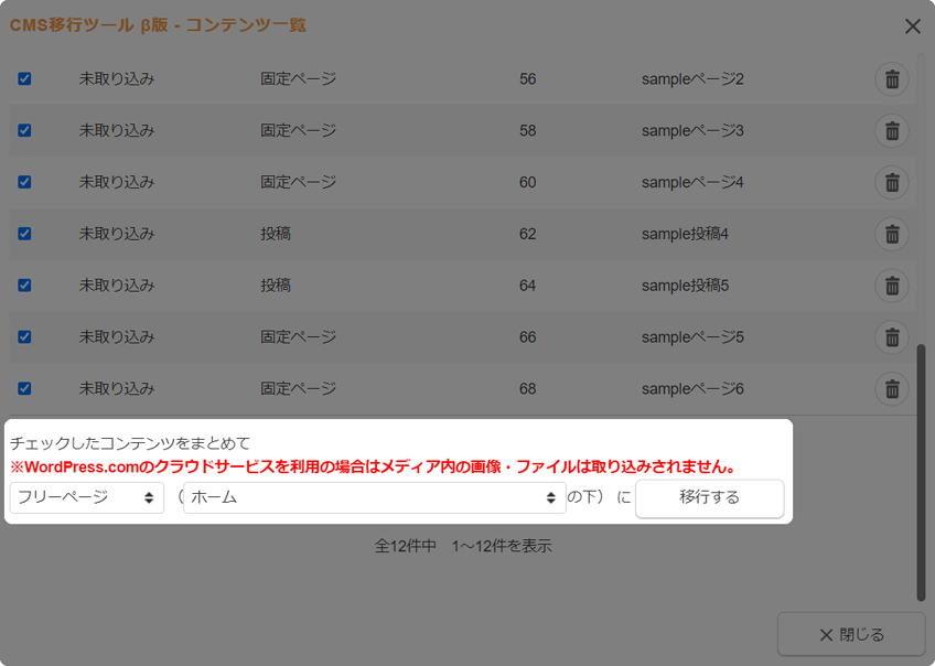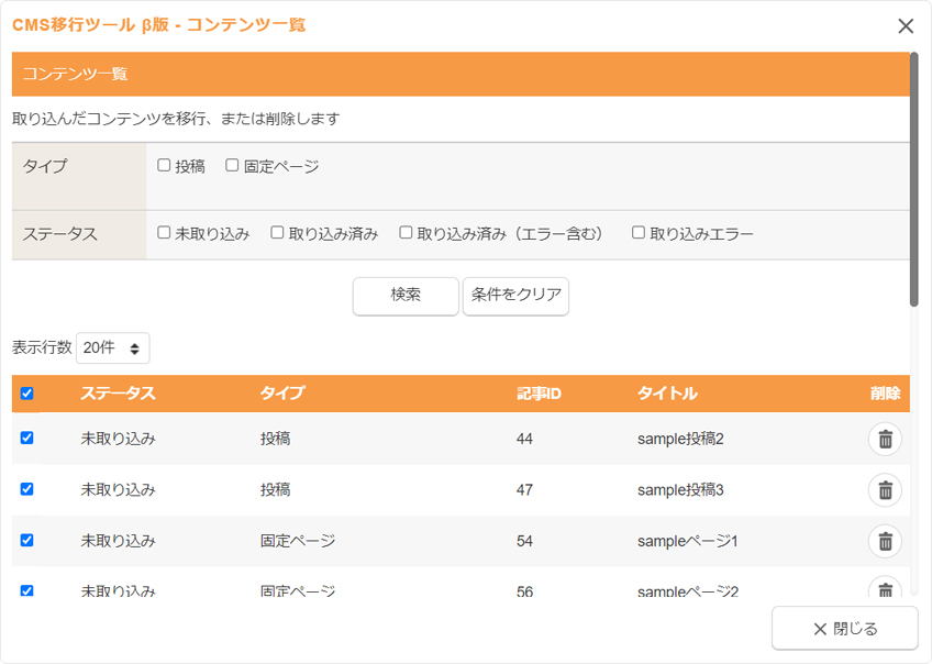エクスポートファイルのアップロードが完了後、“CMS移行ツール β版 - コンテンツ一覧ダイアログ”が表示されます。