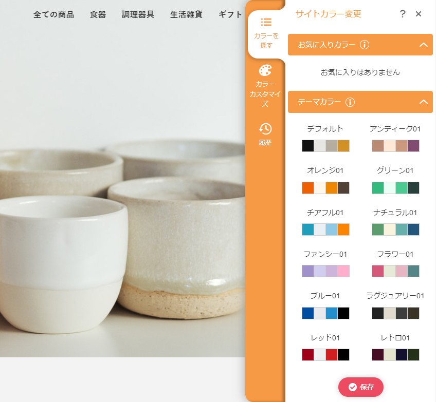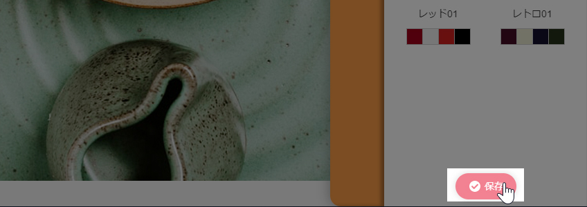 • サイドバーの【カラーを探す】タブまたは【カラーカスタマイズ】タブからサイトカラーを変更後に保存していない場合、サイドバーを閉じると破棄されます。サイトカラーの変更内容を保存するときは、[保存]ボタンを押して変更内容を保存してご利用ください。