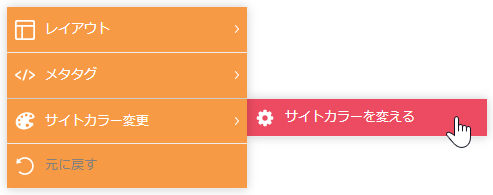 サイトカラー変更対応のデザインを設定すると、コントロールパネルの[作成][デザイン][サイトカラーを変える]のメニューが表示されます。サイトカラー変更については下記の機能を参照してください。詳しくは「サイトカラーを変える」を参照してください。