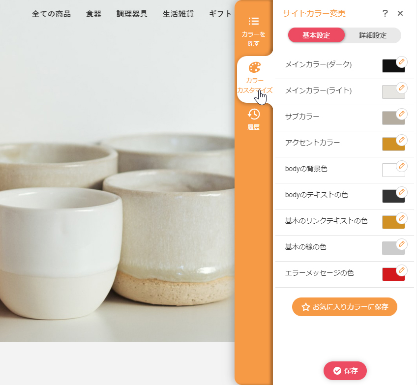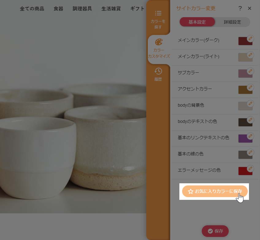 【カラーカスタマイズ】タブで設定したカスタマイズしたサイトカラー(基本設定・詳細設定)を[お気に入りカラーに保存]ボタンを押してお気に入りカラーに登録します。