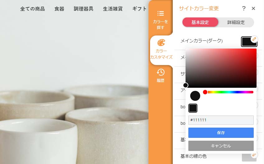 カラーピッカーから設定したい色を選択、またはカラーコードを入力し、[保存]ボタンを押すと、変更した箇所が保存した色に置き換わって表示(プレビュー)されます。