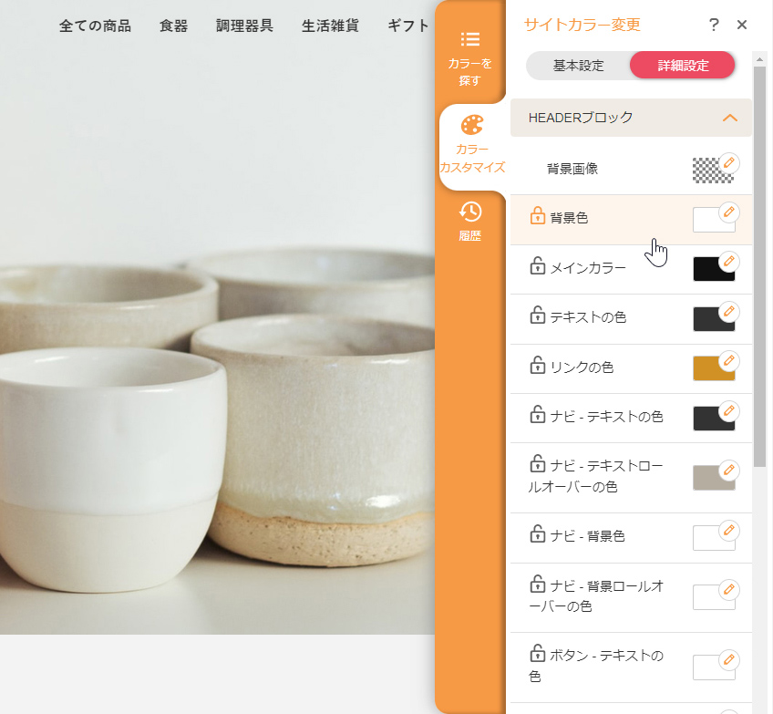 [詳細設定]を選択すると、テンプレートのレイアウトのブロックごとに分類された詳細カラーをカスタマイズすることができます。
