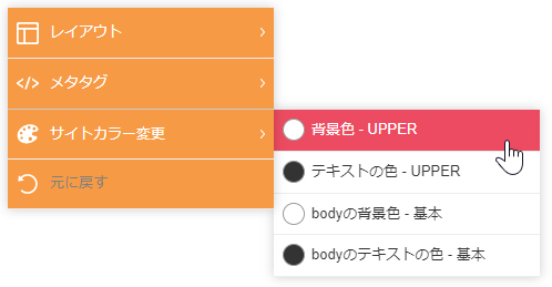 画面の上にマウスを合わせて表示される[メニュー]ボタンをクリックし(もしくは右クリックし)、ショートカットメニューの[サイトカラー変更][サイトカラーを変える]を選択します。