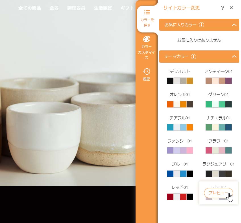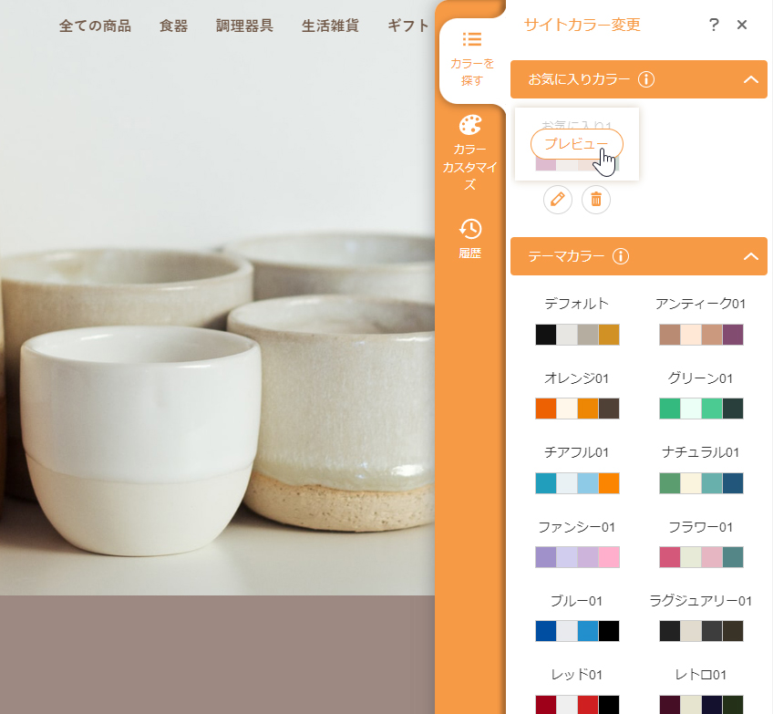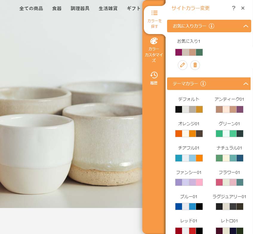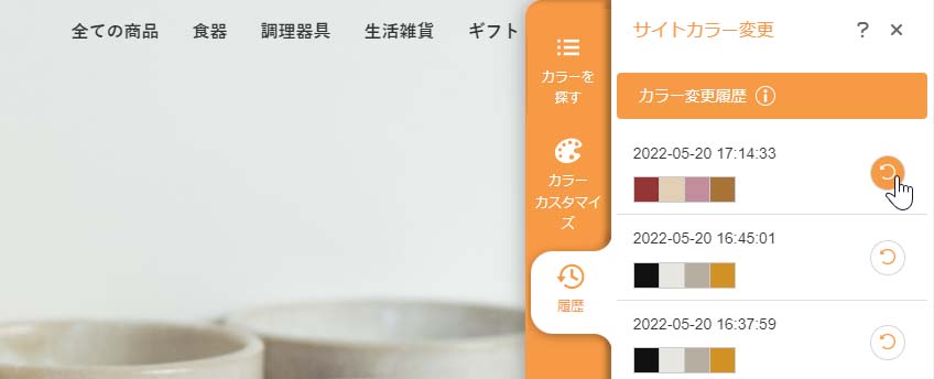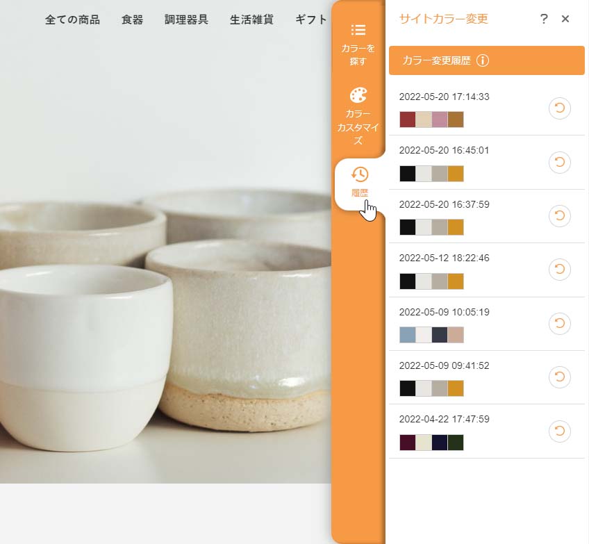 【カラーを探す】タブおよび【カラーカスタマイズ】タブで[保存]ボタンを押して保存した履歴からその時点のサイトカラーおよび背景画像に戻します。