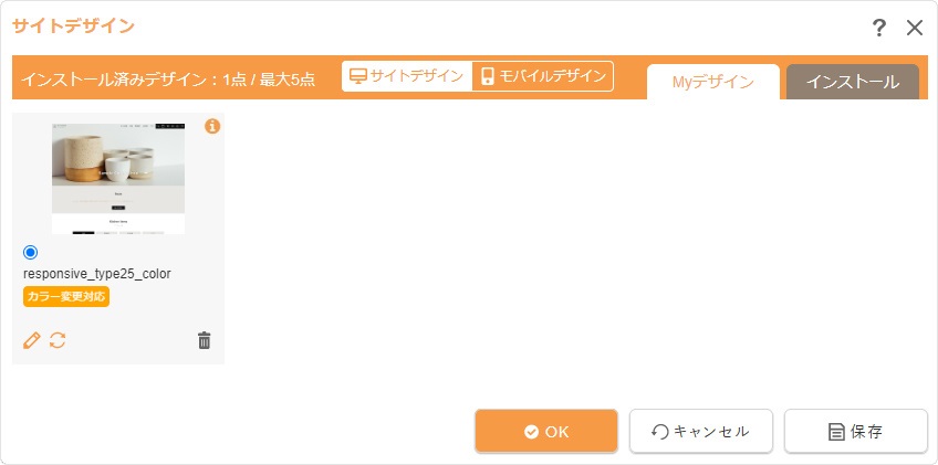 【Myデザイン】タブにインストール済みのデザインが表示されます。サイトカラー変更に対応するデザインにはカラー変更対応と表示されるため、対応するデザインにチェックを入れて[OK]ボタンをクリックします。