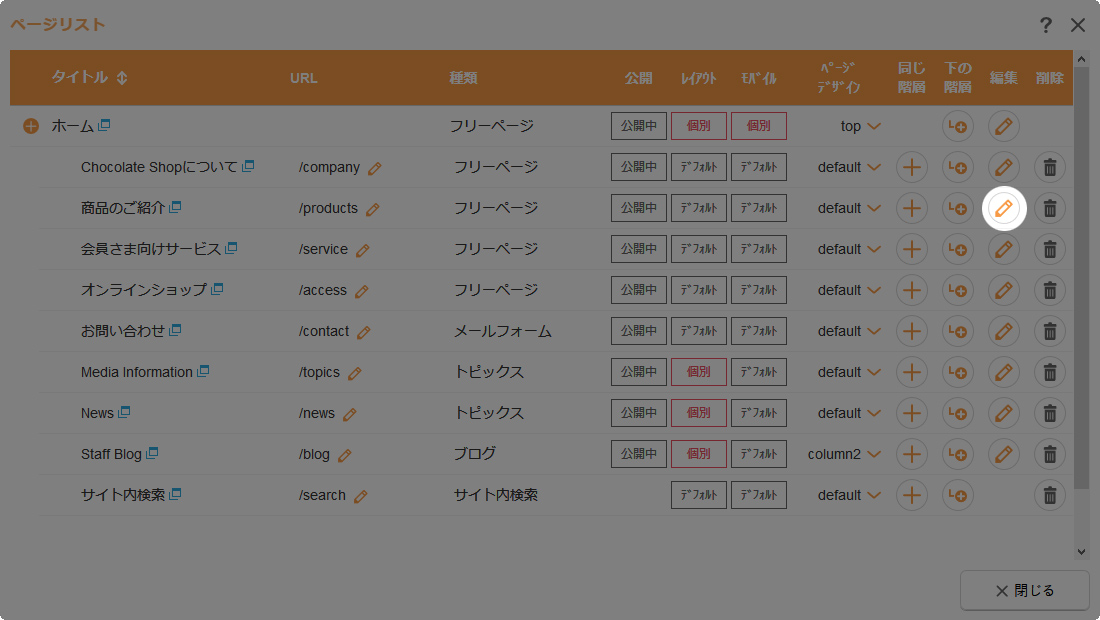コントロールパネルの[作成] → [コンテンツ管理] → [ページリスト]を選択すると、“ページリストダイアログ”が表示されます。