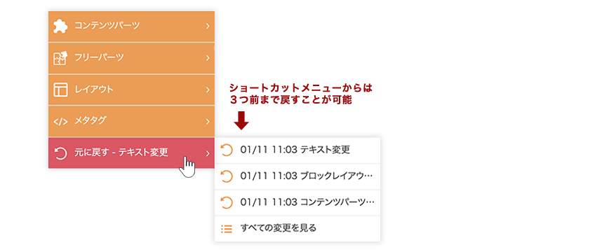 編集サイトでは、直前の変更はもちろん、毎ログアウト時に自動的にバックアップをとっているため、いくつか前のログアウト時にまで作業を元に戻すことができます。