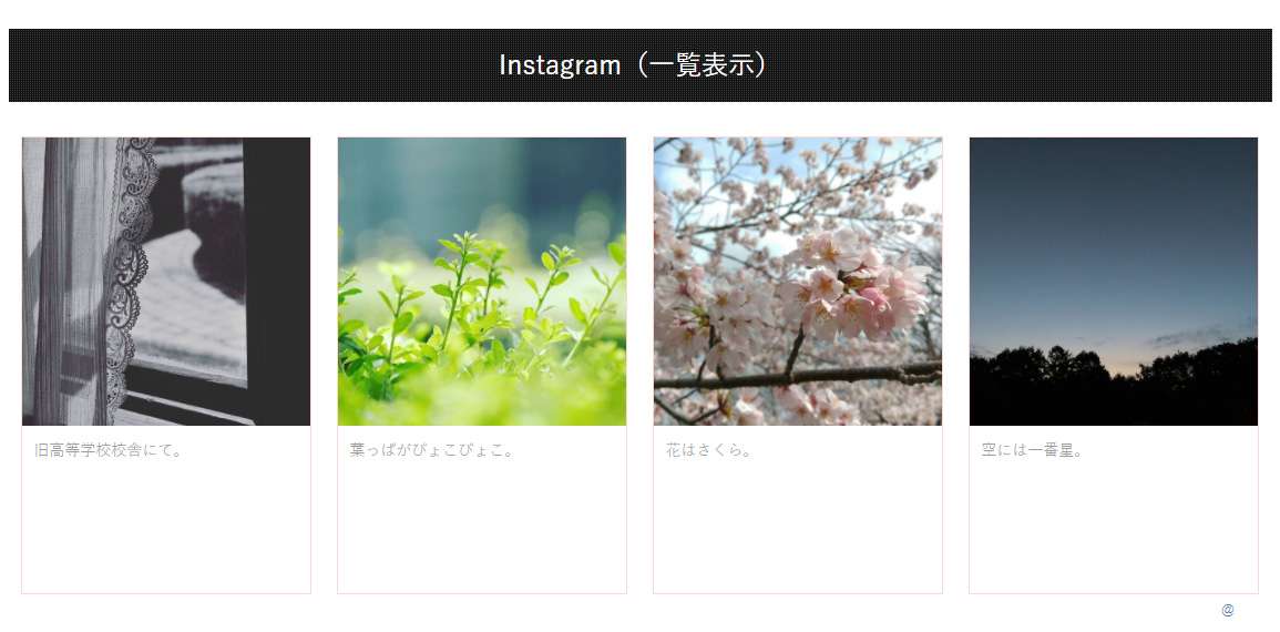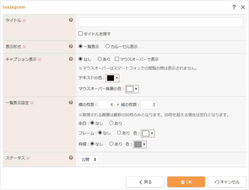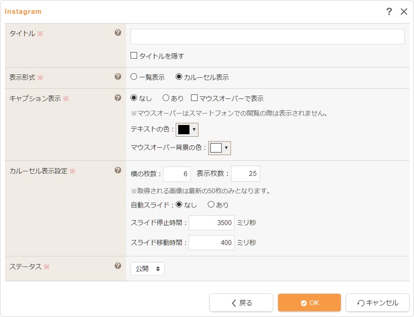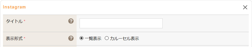 タイトル | Instagramの表示設定のタイトルを入力します。 「タイトルを隠す」にチェックを入れると、タイトルは表示されません。 |