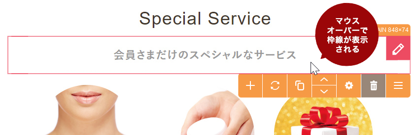 ページ内の文字や画像を追加したいところにマウスを合わせると枠線が表示されます。