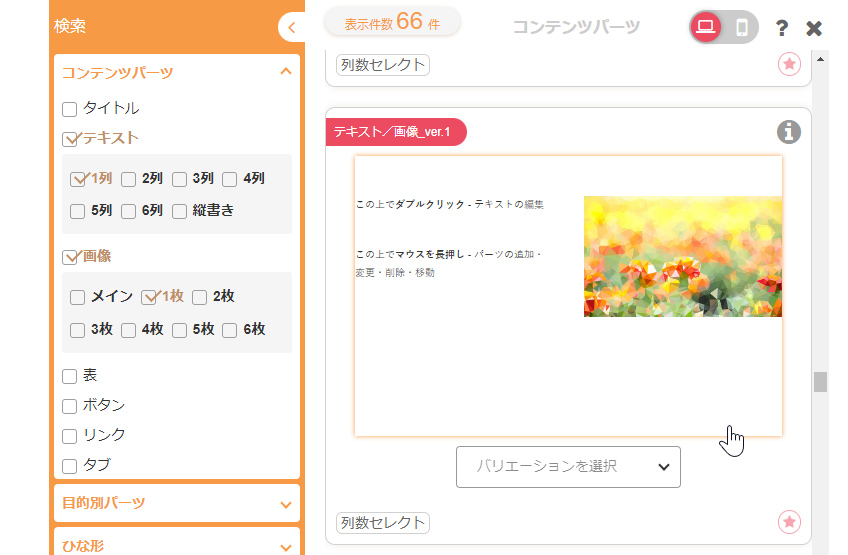 3 コンテンツパーツ画面から追加したいパーツを選択します。
