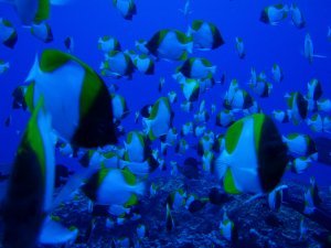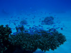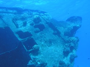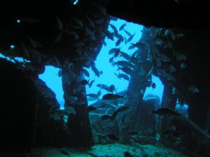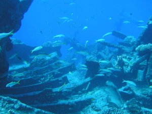 かなりのエリアに渡って残骸が散らばっており、ロクセンスズメダイなどが餌付けされており、アカヒメジや、たまにサメも