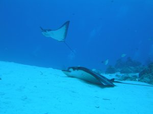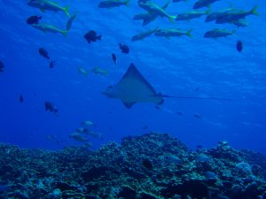 水深7mのトップにはソメワケベラが棲み、それに掃除してもらおうとマダラトビエイが集まってくる。