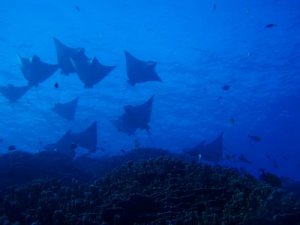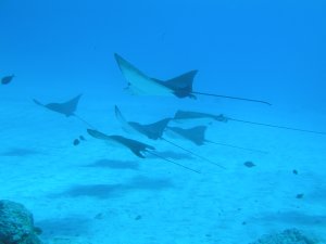 多い時で50匹以上、平均で15~20匹のマダラトビエイが集まってくる。