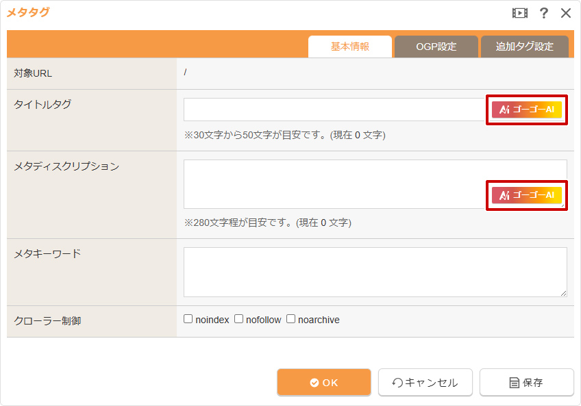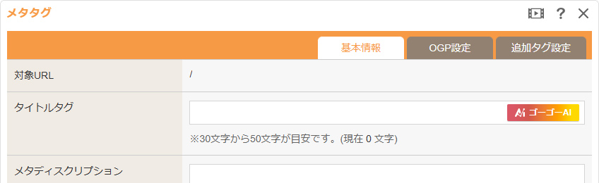 “メタタグダイアログ”の《タイトルタグ》または《メタディスクリプション》の[AIアイコン]