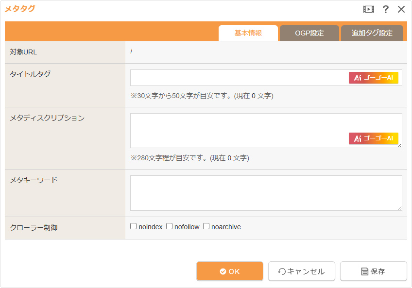 | メタディスクリプション | メタタグのディスクリプションの値を設定します。 テンプレートの設定や各コンテンツの概要設定に関わらず、ここに入力した値が出力されます。未入力の場合は、テンプレートの定義内容で出力されます。 [AIアイコン] |