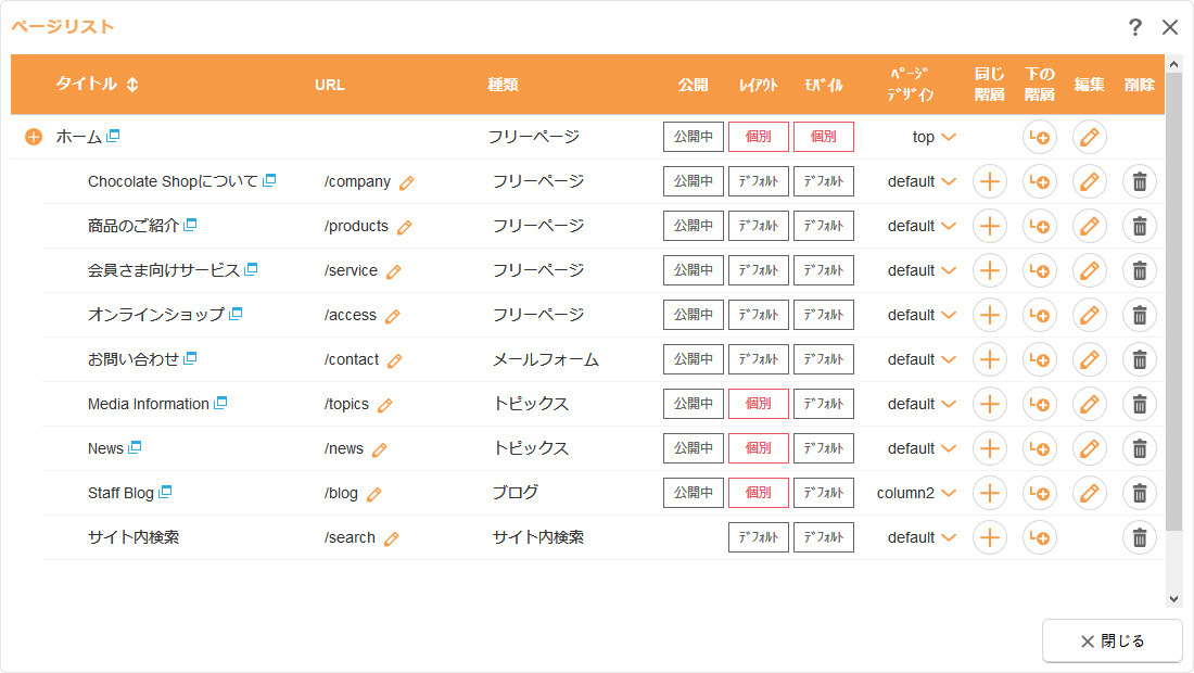 ページリストでは、コンテンツの追加、編集(設定)、削除、並び替え、URLの変更のほか、レイアウト(モバイルレイアウト)の設定、ページデザインの編集を行うことができます。