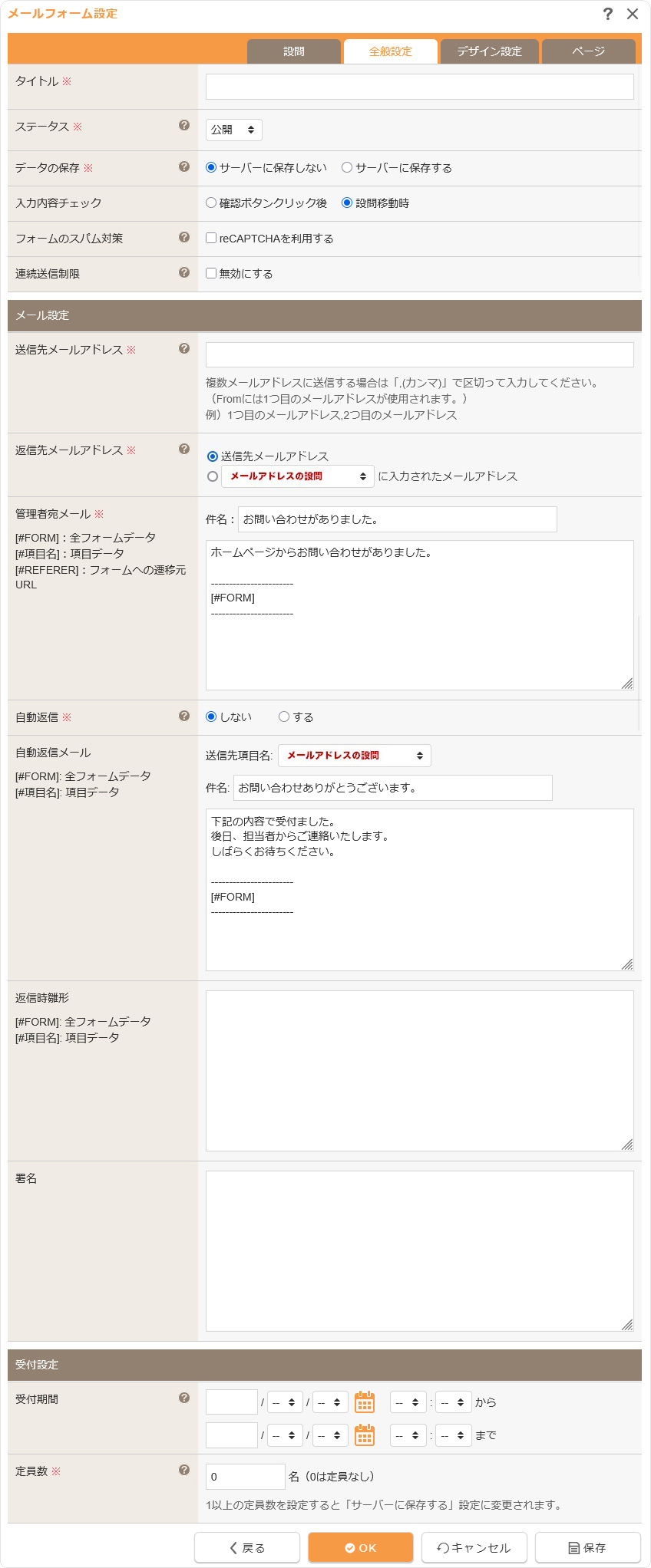 | 受付期間 | メールフォームから投稿を受け付ける開始日時、終了日時を設定します。詳しくは「受付期間・定員の設定」について参照してください。 |
