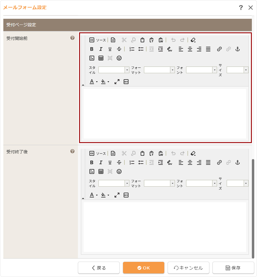 開始日時を設定している場合は、【ページ】タブをクリックし、開始日時前に表示される内容を《受付開始前》に作成します。