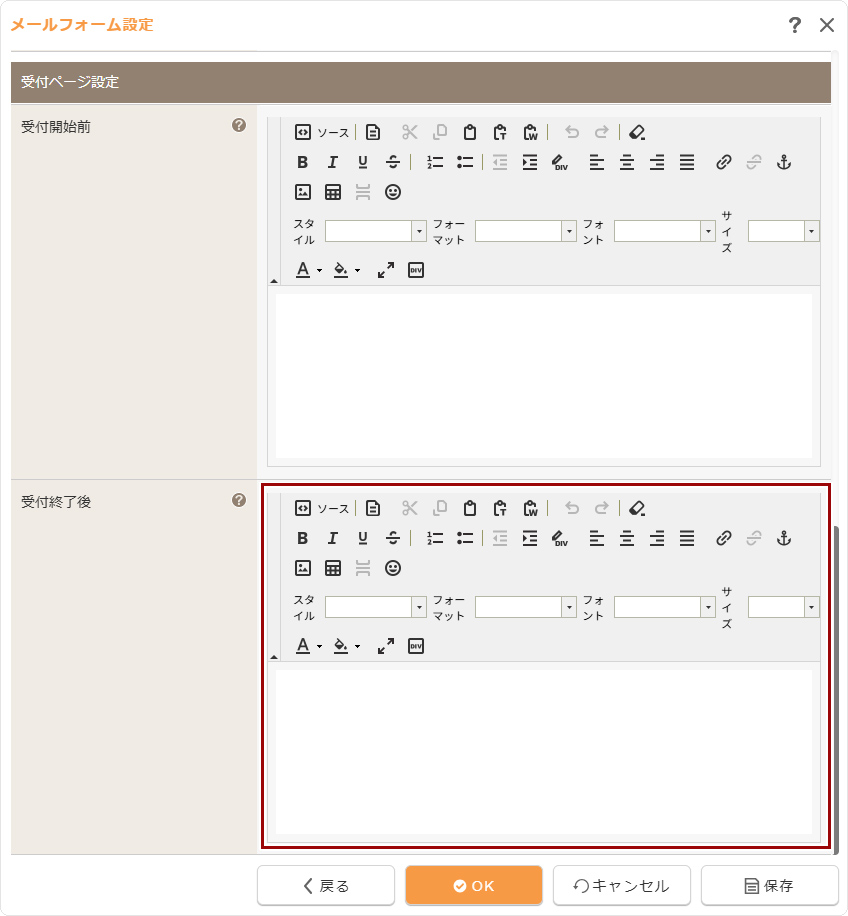 | 受付期間 | メールフォームから投稿を受け付ける開始日時(未設定可)、終了日時(未設定可)を設定します。