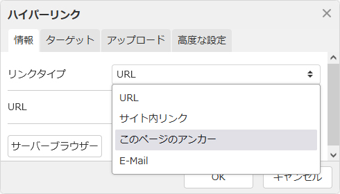 リンクタイプから「このページのアンカー」を選択し、さらにアンカーの一覧から該当するアンカー名を選択します。