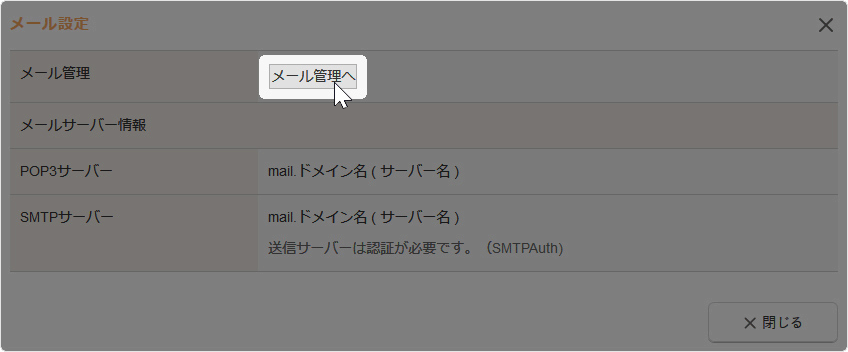 “メール設定ダイアログ”が表示されますので、[メール管理へ]ボタンをクリックしてください。