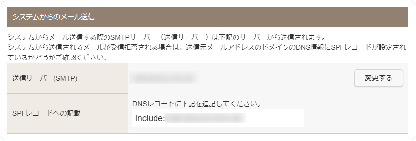 DNSレコードに追記するSPFレコード「include:~」が表示されます。SPFレコードが未設定の場合は、「SPFレコード記述例」を参考に送信元メールアドレスのドメインのDNS情報にSPFレコードを設定してください。 SPFレコード記述例