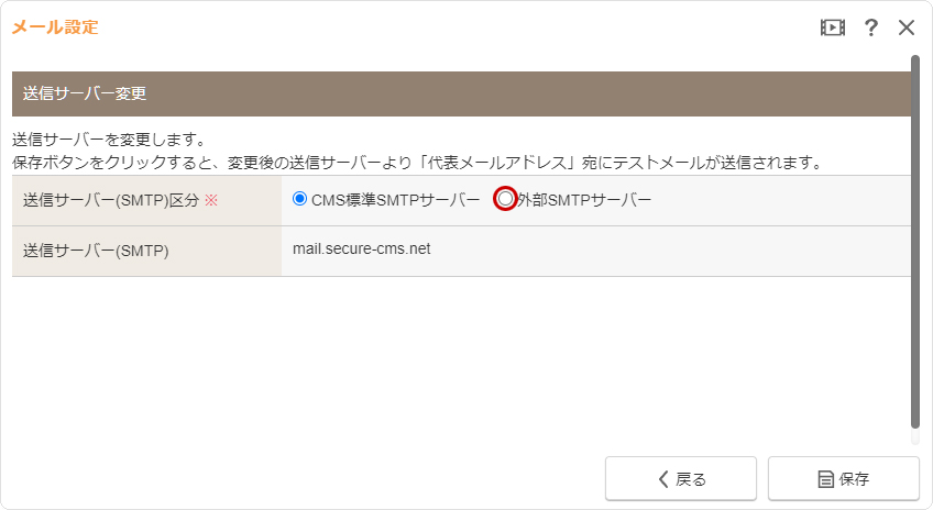 - CMS標準SMTPサーバーに変更する場合は「CMS標準SMTPサーバー」を選択し、[保存]ボタンをクリックして手順5に進みます。