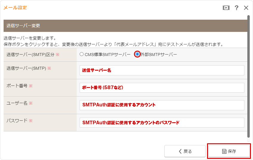 - 送信サーバーの変更に必要な情報は、外部メールサーバー管理会社へご確認ください。