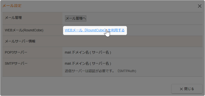 有料プランで当CMS付属メールサーバーをご契約の場合は、コントロールパネルからメールサーバーの管理画面にアクセスすることができます。