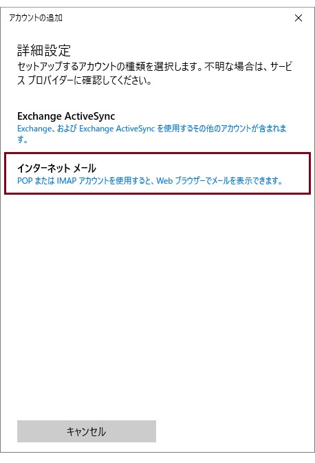 “詳細設定”画面で「インターネット メール」をクリックします。