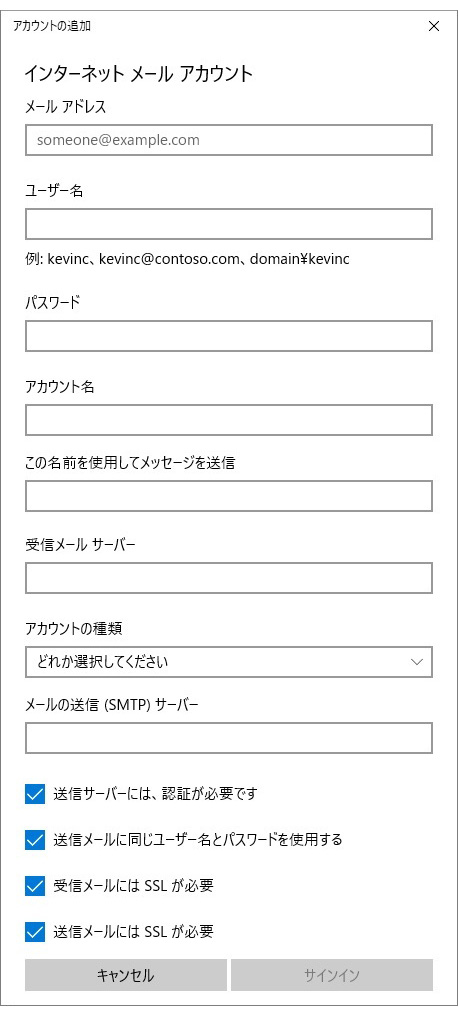 “インターネット メール アカウント”画面で各項目を入力し、[サインイン]をクリックします。