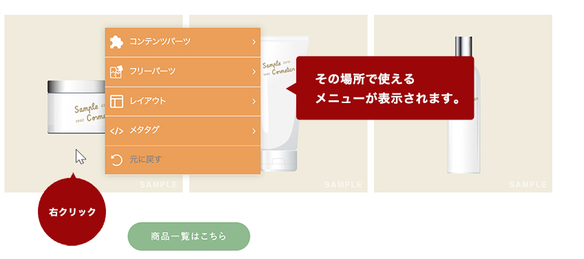 - メインコンテンツの画像やテキストの上で右クリックして表示されるメニュー