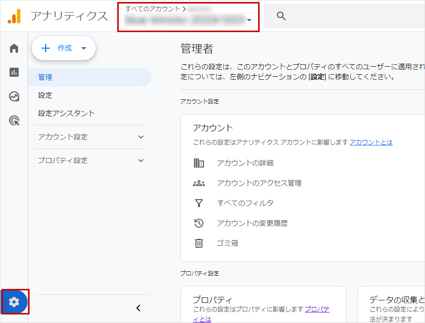 アナリティクスのホーム画面が表示されますので、連携するアナリティクスアカウントのGA4プロパティを選択し、ナビゲーションメニューの左下の[管理]をクリックします。