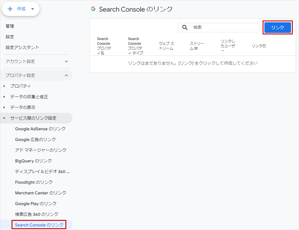 プロパティ設定の[サービス間のリンク設定] → [Search Consoleのリンク]を選択し、Search Consoleのリンク画面の[リンク]をクリックします。